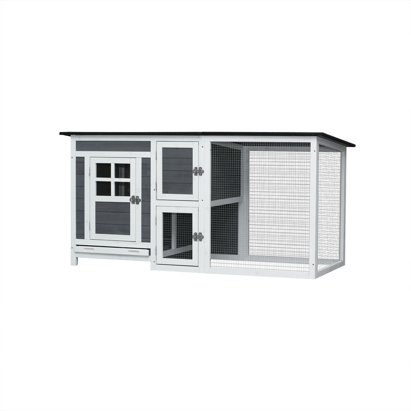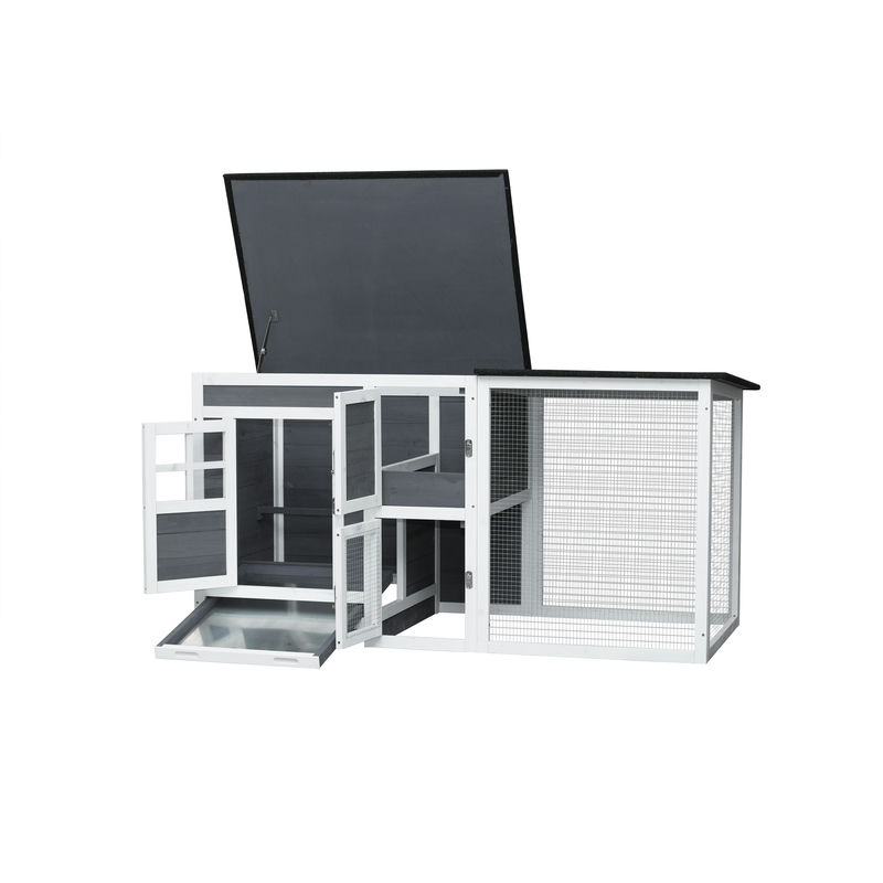 1. There is enough room for 3-4 chickens, it can be used as a home for small animals, such as rabbit coop, duck house, guinea pig cage, etc 2. Movable tray makes it easier for you to clean the pet cage, and the clean pet rabbit cage will give your pet a more comfortable life experience 3. All front panels of this guinea pig cages can be open for easy access and entire top raises up on strong hinge and can stay open, the top is solid so you can store stuff on top of it 4. The outdoor rabbit hutch is made of high-quality fir wood, protct your bunnies from predator. The rabbit cages come with all necessories with labeled and pre-drilled.You can use an electric drill to install it and it will take you about 20 minutes 5. If you have any questions about our outdoor chicken coop, please contact us in time and we will solve your problem within 24 hours