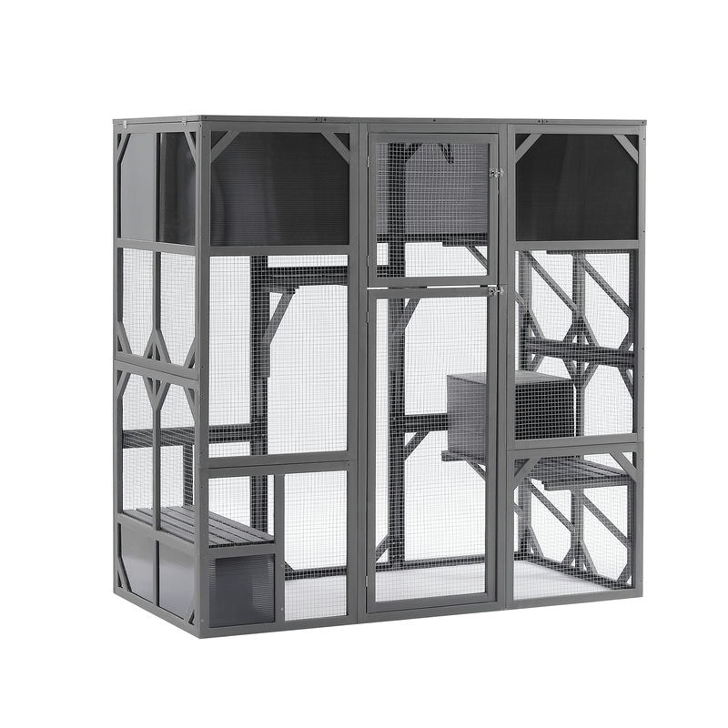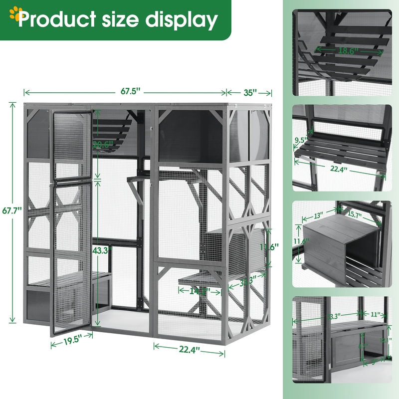 Outdoor Wooden Cat House Catio Enclosure with Super Large Enter Door Cat Kennel with Bouncy Bridge, Platforms and Small Houses Walk in Kitten Cage with Sunshine Board – L67.5”, Dark Grey