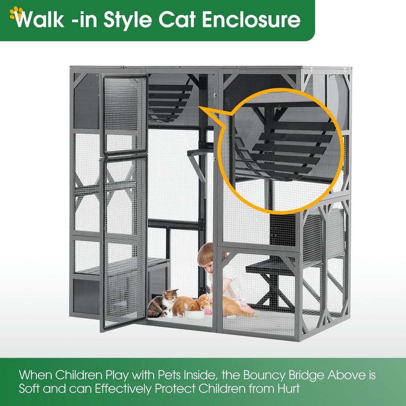 - 【Well-Designed Cat House】 Outdoor cat enclosure includes 2 Platforms, 1 Middle Platform, 1 Seating Platform, 1 Resting Box, and 1 Bouncy Bridege. Spacious living area is the perfect solution to keep your cats safe and enjoy nature within a catio space.