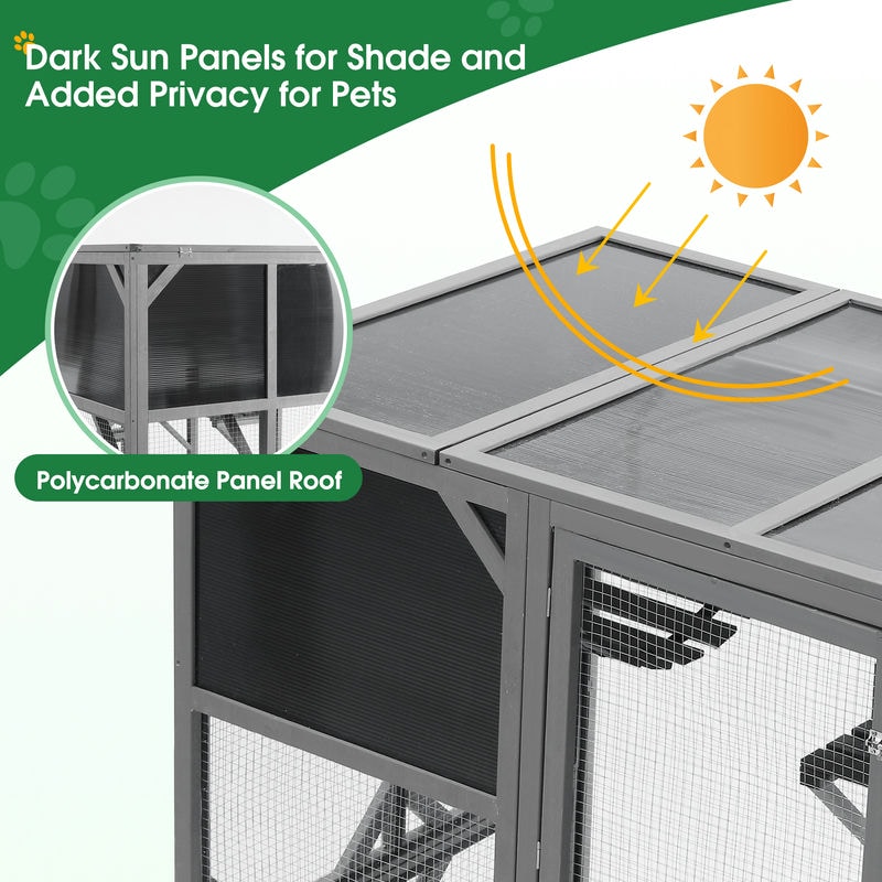 - 【Reliable Material】 Made of sturdy wood frame, mesh walls and dark polycarbonate Panel, which allows for long-term outdoor use. This durable design ensures cats can scratch to their hearts’ desire, so your enclosure can last. This cat cage’s frame won’t be hazardous to your pets since all the wire mesh frame have been wrapped with woven tape.Dark sun panels provide shade, UV protection, and increased privacy for cats.